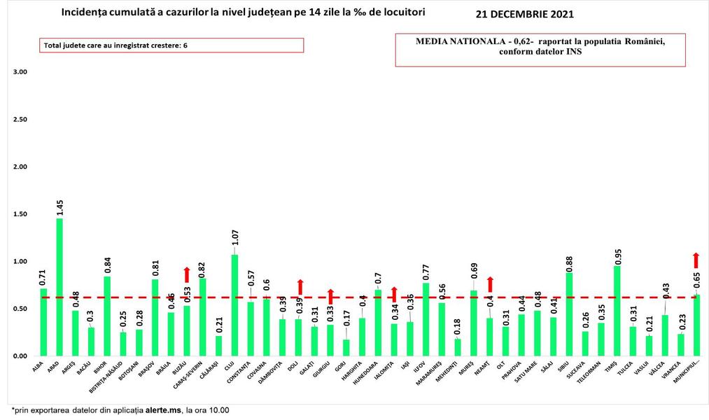 Rata de infectare la nivel național este de 0,62, cel mai mare indice COVID-19 fiind în Arad – 1,45, iar cea mai mică în Gorj – 0,17, potrivit datelor oficiale de marți, transmise de Grupul de Comunicare Strategică.