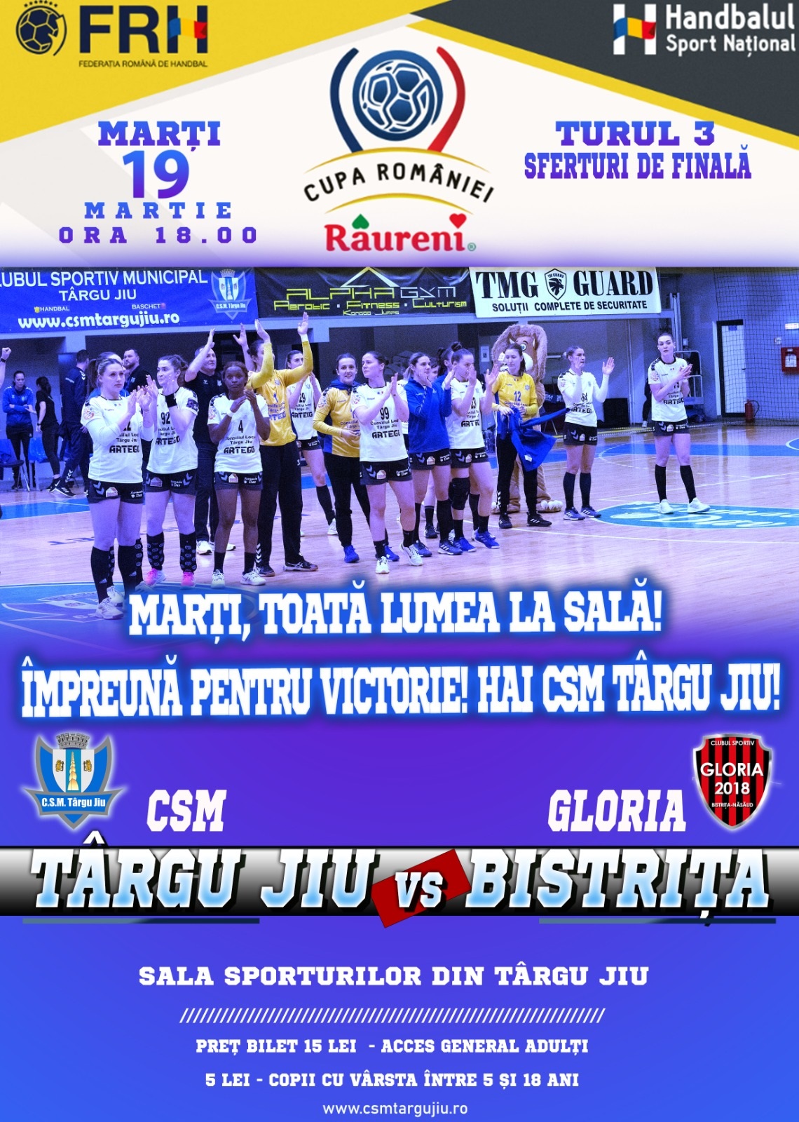 Sala Sporturilor din Târgu Jiu găzduieşte, astăzi, de la ora 18:00, confruntarea dintre CSM Târgu Jiu și Gloria Bistrița din sferturile de finală ale Cupei României Râureni, ediția 2023-2024. Meciul se anunță unul foarte dificil, dar CSM Târgu Jiu este hotărâtă să lupte pentru o nouă calificare în Final 4. Echipa lui Liviu Andrieș mizează și pe susținerea publicului gorjean.