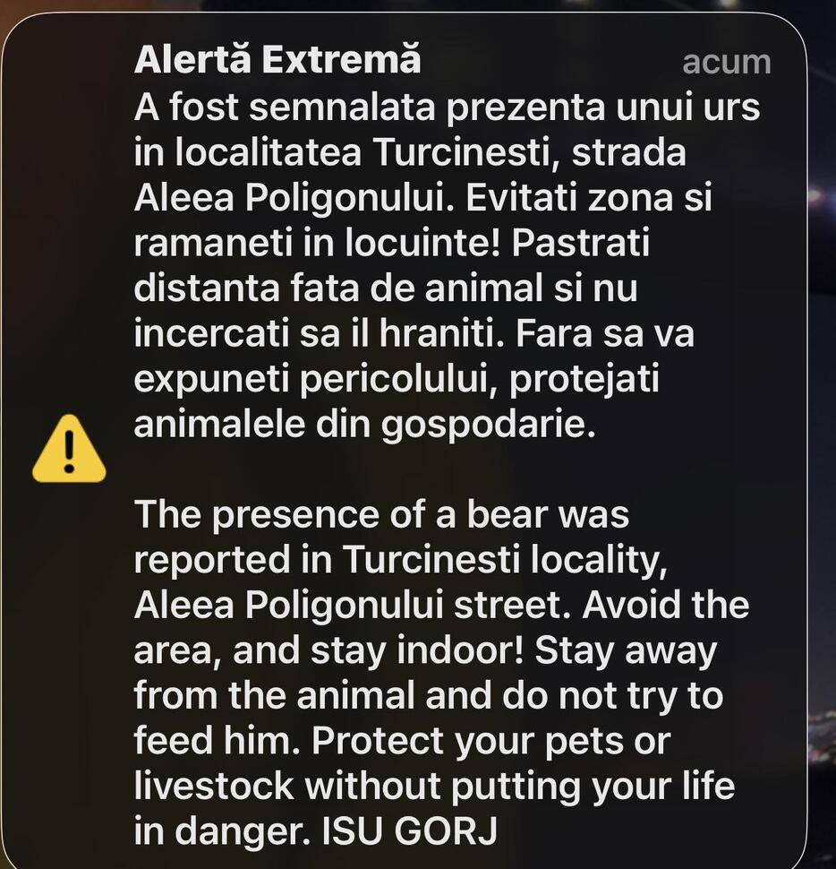 Inspectoratul pentru Situații de Urgență Gorj a transmis, joi seară, un mesaj RO-Alert după ce prezența unui urs a fost semnalată în comuna Turcinești, pe strada Aleea Poligonului.