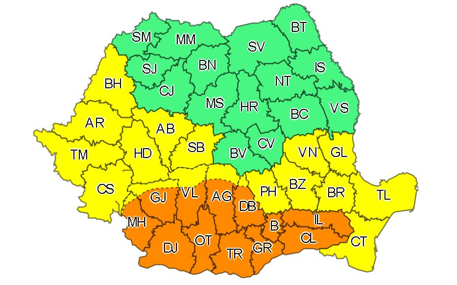 Un cod portocaliu vizează parţial judeţele Mehedinţi, Gorj, Vâlcea, Argeş şi Dâmboviţa şi integral judeţele Ialomiţa, Călăraşi, Giurgiu, Ilfov, Teleorman, Olt, Dolj şi municipiul Bucureşti. Temperaturile maxime vor atinge, în general, 38…39 de grade,…