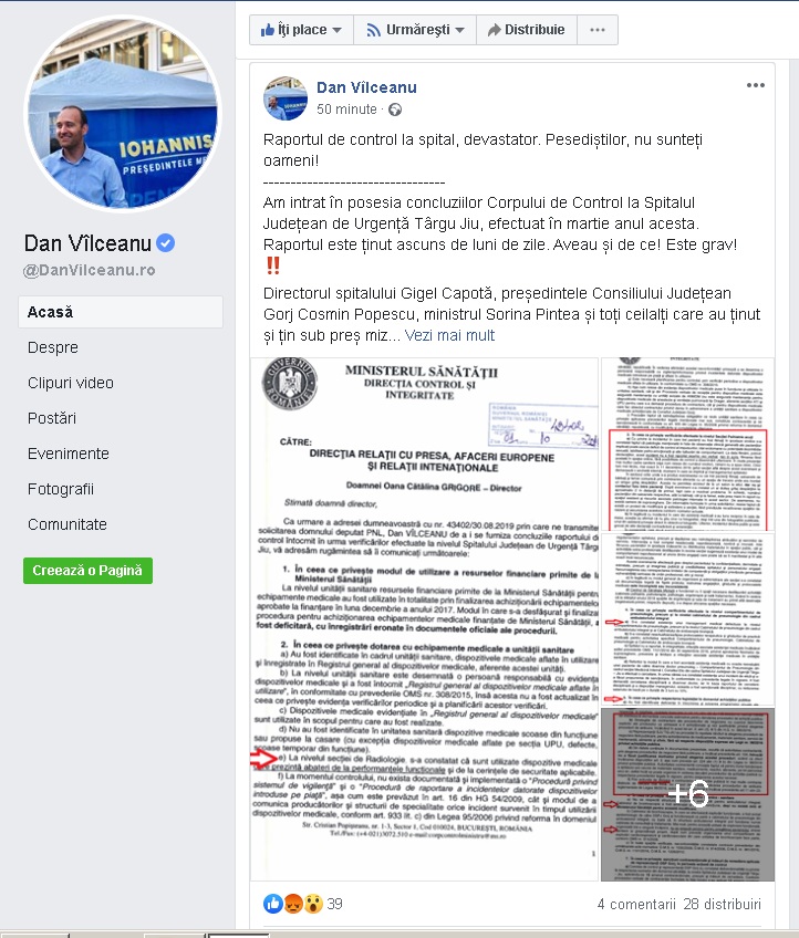 Deputatul Dan Vîlceanu publică, pe pagina de socializare, concluziile verificatorilor Ministerului Sănătății, în urma controlului făcut în primăvară la Spitalul Județean de Urgență Târgu-Jiu. Președintele Consiliului Județean Gorj, Cosmin Popescu, a refuzat să-l facă public pe motiv că ar conține date cu caracter personal ale angajaților și unor pacienți.