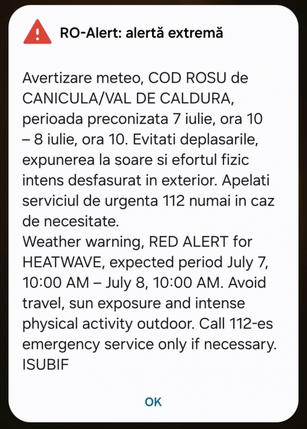 Potrivit notificării oficiale transmise prin sistemul RO-Alert, valabilă pentru perioada 7 iulie, ora 10:00 – 8 iulie, ora…