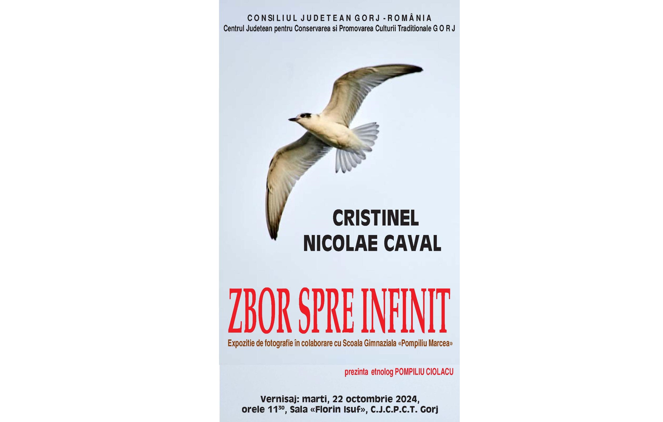 „Zborul spre infinit”, o expoziție de fotografie dedicată păsărilor din mica deltă de lângă Târgu Jiu, semnată Cristinel Nicolae Caval, poate fi vizionată, marţi, începând cu ora 11:30, în Sala „Florin Isuf” a Centrului Judetean pentru Conservarea și Promovarea Culturii Tradiționale Gorj.