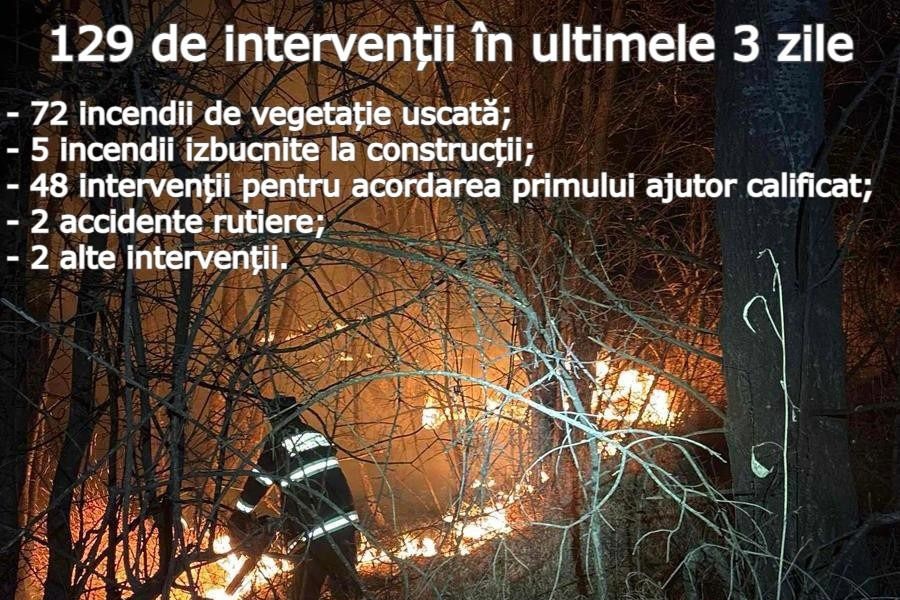 Pompierii gorjeni au fost solicitați să intervină, în ultimele 3 zile, pentru gestionarea a 129 de situații de urgență: 72 incendii de vegetație uscată, 5 incendii izbucnite la construcții, 48 intervenții pentru acordarea primului ajutor calificat, 2 accidente rutiere, 2 alte intervenții, arată ISU Gorj, într-un comunicat de presă.