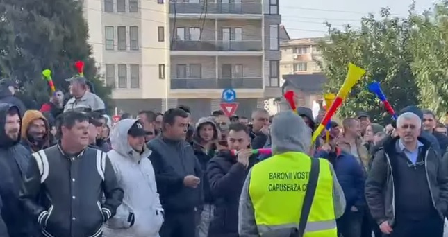 Protestatarii au venit cu vuvuzele și scandează pentru păstrarea locurilor de muncă.