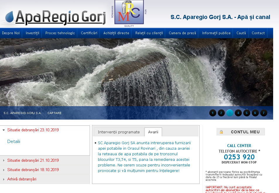 Operatorul de apă și canal Aparegio anunță întreruperea furnizării apei potabile în orașul Rovinari, din cauza unei avarii.