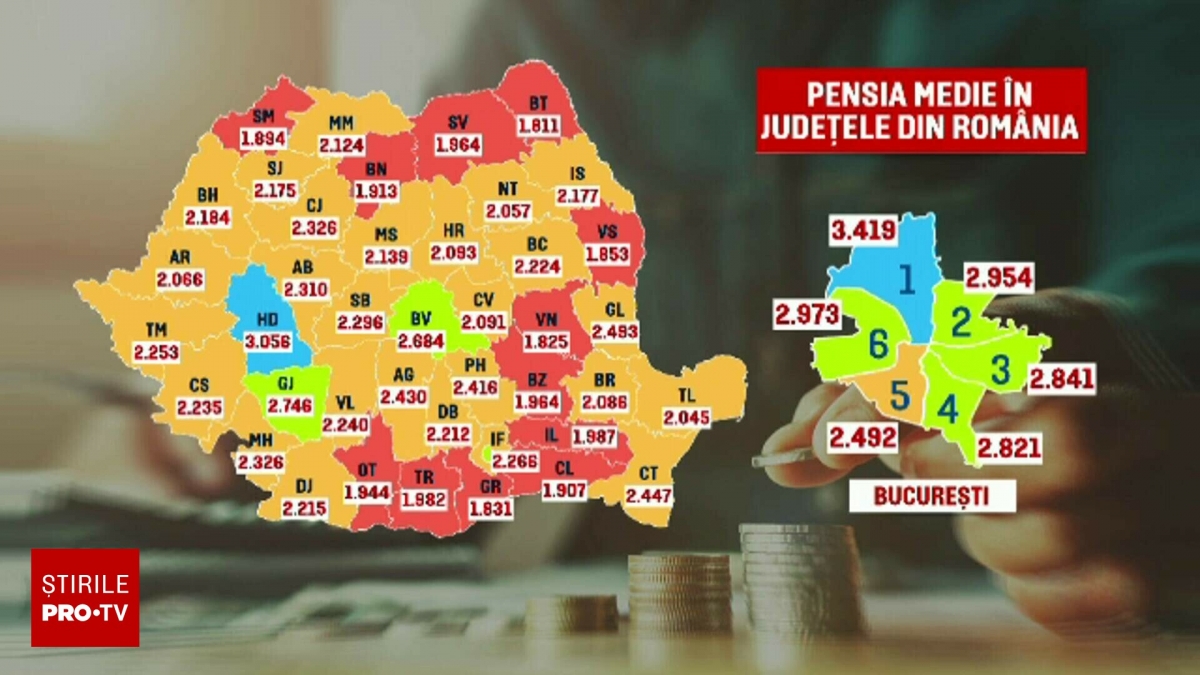 Cele mai mari pensii medii sunt în județele Gorj și Hunedoara, întrecute doar de pensia medie din sectorul 1 al Capitalei, care depășește suma de 3.400 de lei. În Botoșani sau Giurgiu, pensionarii abia ajung la o pensie medie de 1.800 de lei.