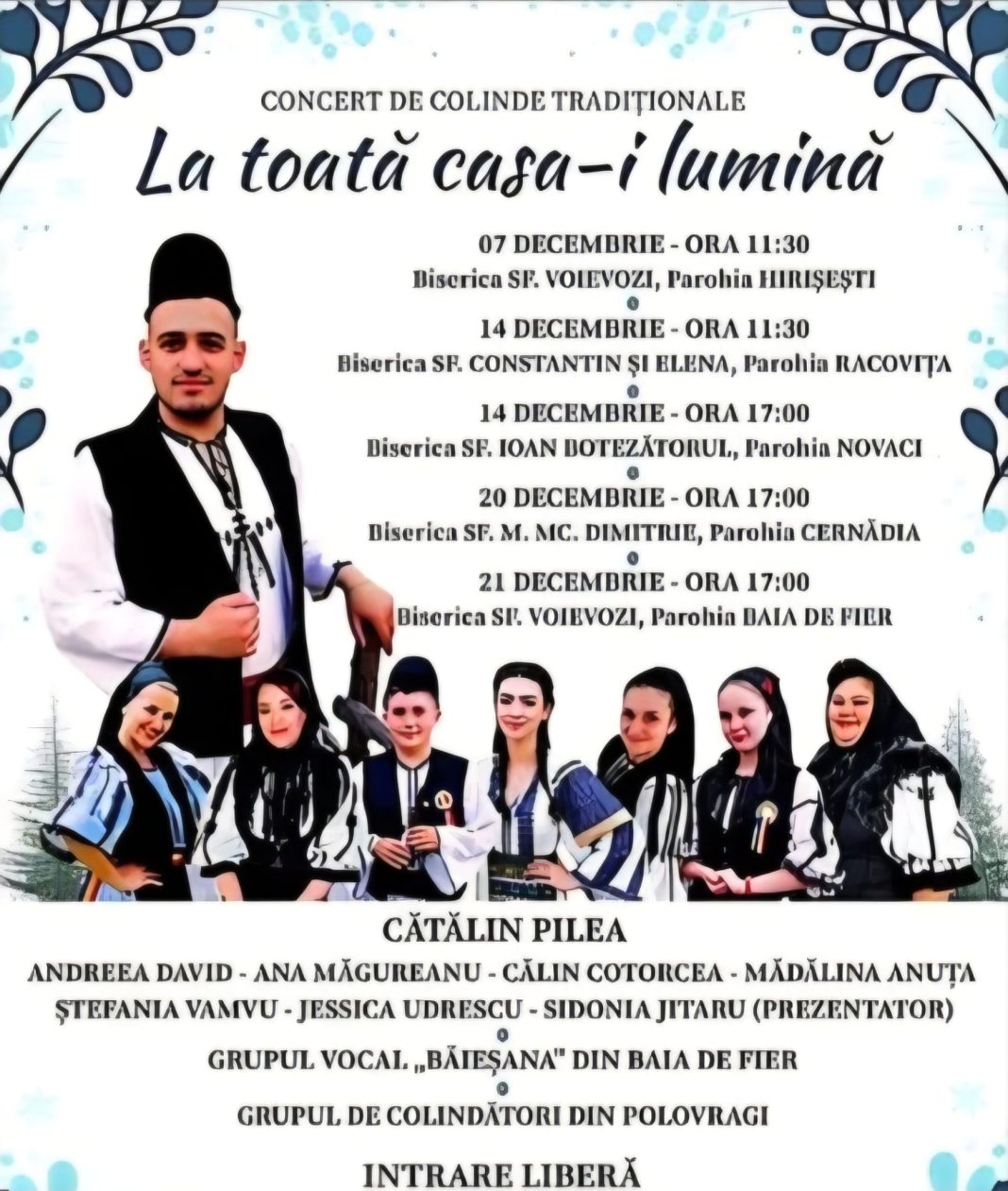 Un amplu eveniment cultural și religios, intitulat „La toată casa-i lumină”, va fi organizat în luna decembrie, în mai multe parohii din județul Gorj. Concertul de colinde tradiționale va reuni tineri interpreți, grupuri vocale și colindători, care vor aduce în atenția publicului obiceiurile specifice sărbătorilor de iarnă.
