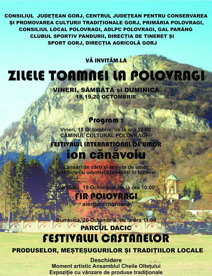 ”Zilele Toamnei la Polovragi”, un eveniment organizat cu sprijinul Consiliului Județean Gorj, se desfășoară în zilele de 18,19 și 20 octombrie. Căminul cultural din localitate găzduiește, vineri, Festivalul Internațional de Umor ”Ion Cănăvoiu”, sâmbătă are loc un concurs de alergare montană, iar, duminică, Festivalul Castanelor.