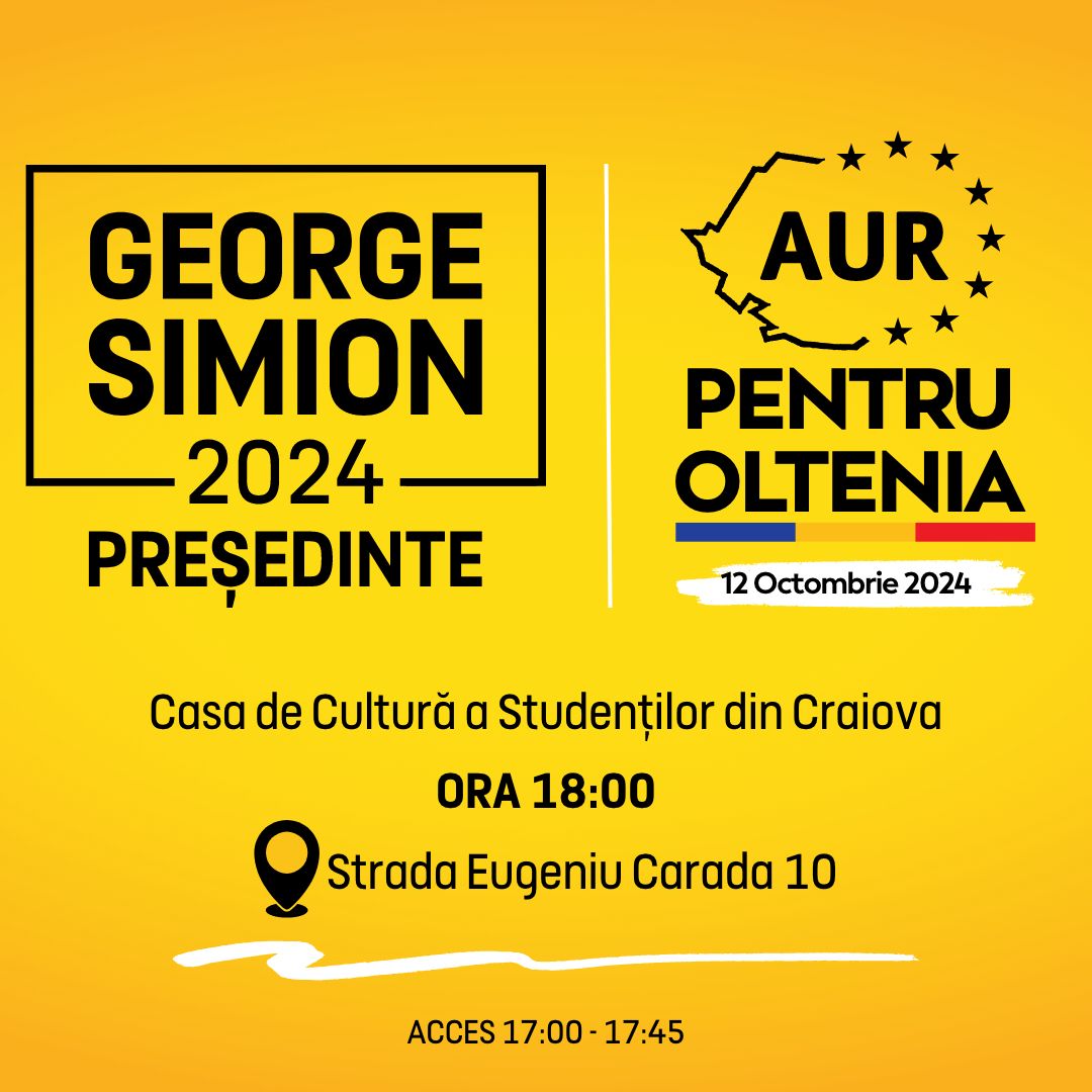 „Alianța pentru Unirea Românilor vă invită sâmbătă, 12 octombrie, la evenimentul „AUR pentru Oltenia”, în cadrul căruia vor fi prezentați candidații pentru alegerile parlamentare din județele Dolj, Mehedinți, Gorj, Olt și Vâlcea. La eveniment va fi prezent și președintele AUR, George Simion, candidat la…