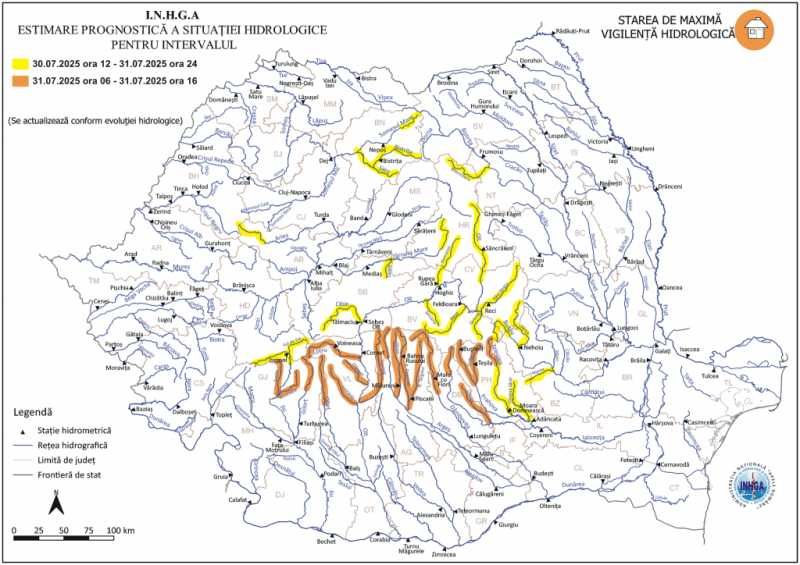 Institutul Național de Hidrologie și Gospodărire a Apelor a emis o actualizare a codurilor hidrologice, în contextul prognozei meteorologice și a situației hidrologice actuale și atenționează asupra riscului de viituri în Oltenia, Muntenia, Transilvania și Moldova.