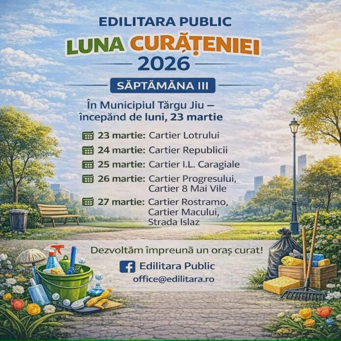 Începând de luni, 23 martie, echipele Edilitara Public S.A. continuă intervențiile din cadrul ”Lunii Curățeniei” în municipiul Târgu Jiu.