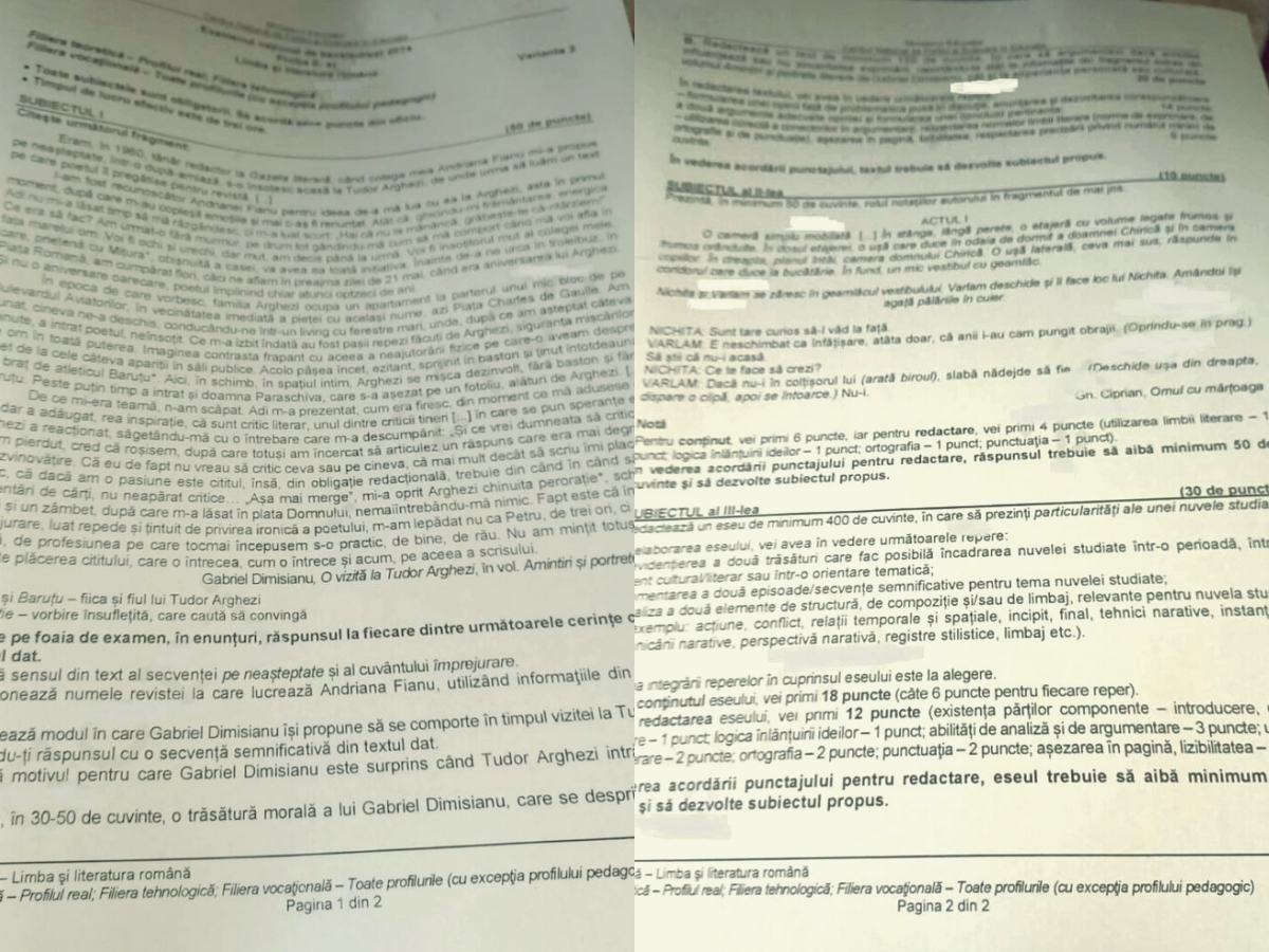 S-a declanșat o anchetă la centrul de examinare nr. 2783, de unde s-au scurs subiectele la proba scrisă a Bacalaureatului la Limba română. Varianta de subiecte a ajuns pe internet la puțin timp după ora 9:00. Stirileprotv.ro a publicat fotografiile la ora 9:20, în condițiile în care elevii termină proba la ora 12:00. Centrul în cauză este la Colegiul Tehnologic ”Ion Mincu”. Poliția Gorj face cercetări.