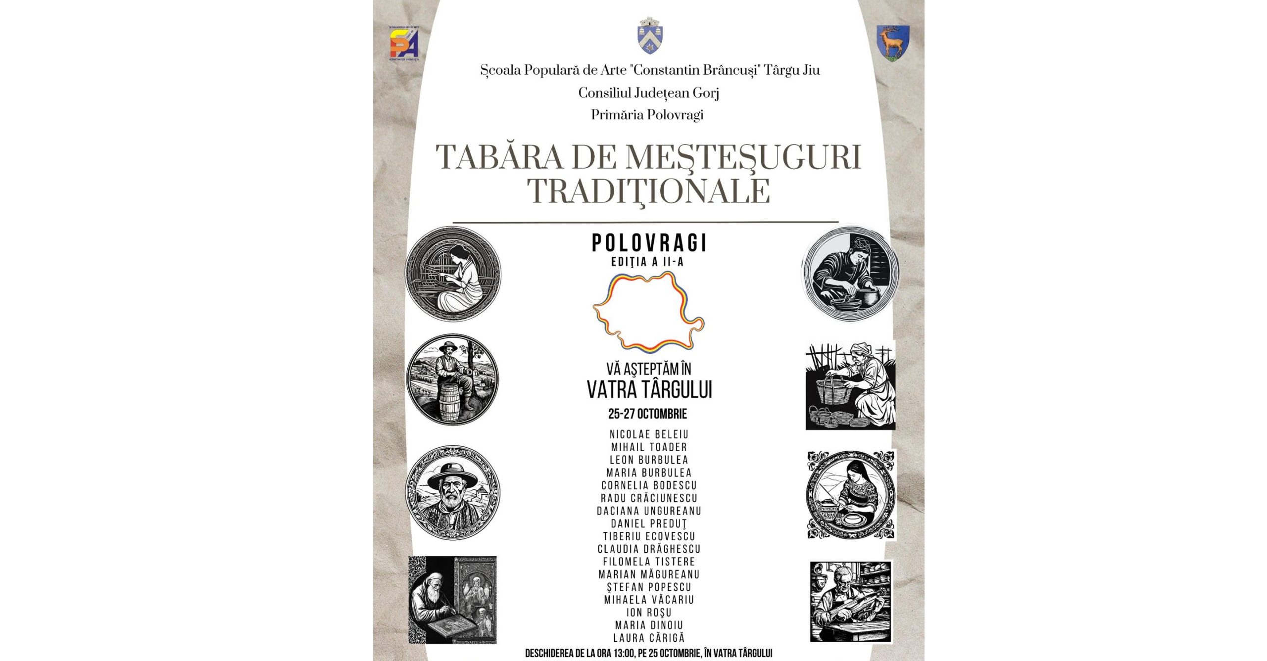 În perioada 25-27 octombrie 2024, Școala Populară de Arte ”Constantin Brâncuși” Târgu Jiu, în parteneriat cu Primăria Comunei Polovragi, organizează, în pitoreasca localitate Polovragi, cea de-a doua ediție a Taberei de Meșteșuguri Tradiționale.