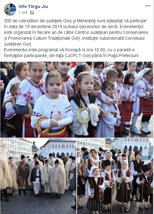 Alaiul Obiceiurilor de Iarnă va avea loc, joi, 19 decembrie, la Târgu-Jiu. Este anunțată participarea a 300 de colindători din județele Gorj și Mehedinți.