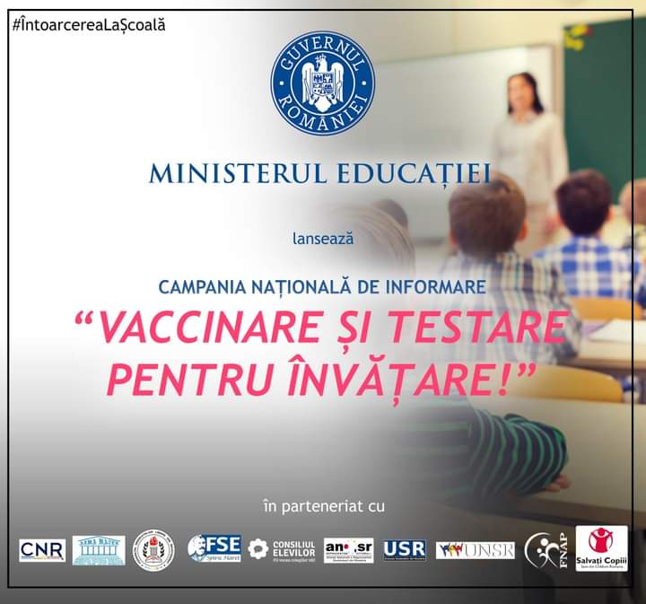 Ministerul Educației a lansat Campania Națională „Vaccinare și testare pentru învățare!”, în parteneriat cu Consiliul Național al Rectorilor, Federația Națională Sindicală Alma Mater, Federația Sindicatelor Libere din Învățământ, Federația Sindicatelor din Educație „Spiru Haret”, Consiliul Național al Elevilor, ANOSR – Alianța Națională a Organizațiilor Studențești din România, Uniunea Studenților din România (USR), Uniunea Națională a Studenților…