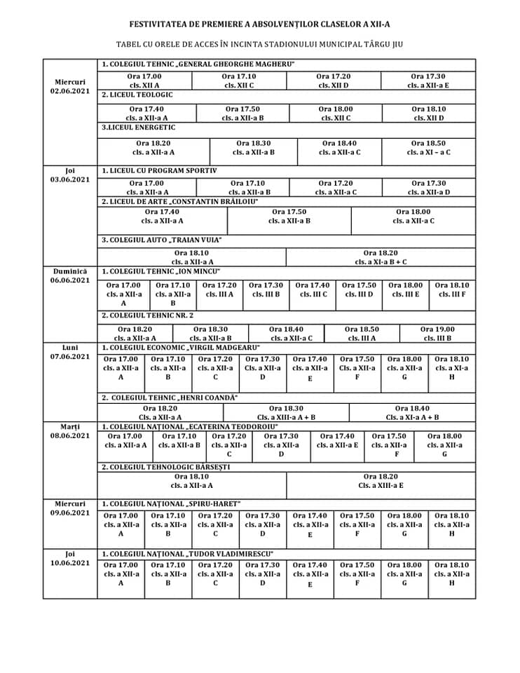 Absolvenții învățământului gimnazial, liceal și postliceal din Târgu Jiu vor fi premiați în cadrul unor ceremonii organizate, începând de săptămâna viitoare, la Stadionul Municipal. ”Vă prezint programul evenimentelor și trebuie menționat faptul că vor fi respectate toate măsurile impuse de legislație în contextul pandemiei. Am luat legătura cu directorii unităților de învățământ, dar și cu reprezentanții instituțiilor care vor monitoriza evenimentele, în…