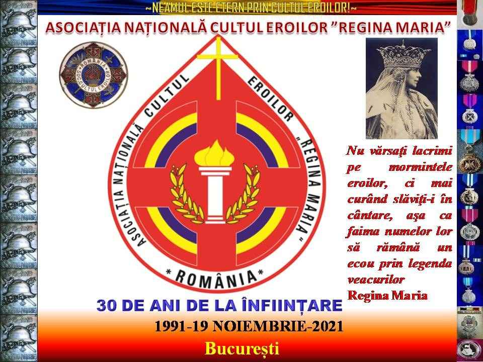 La 19 noiembrie 2021 se împlinesc 30 de ani de la reînființarea ASOCIAȚIEI NAȚIONALE CULTUL EROILOR „REGINA MARIA”, prima și singura structură asociativă, renăscută după desființarea în anul 1948 a precursoarei ei, AȘEZĂMÂNTUL NAȚIONAL „REGINA MARIA” PENTRU CULTUL EROILOR, care după 1989 și-a asumat misiunea de a continua tradițiile Cultului Eroilor la români.
