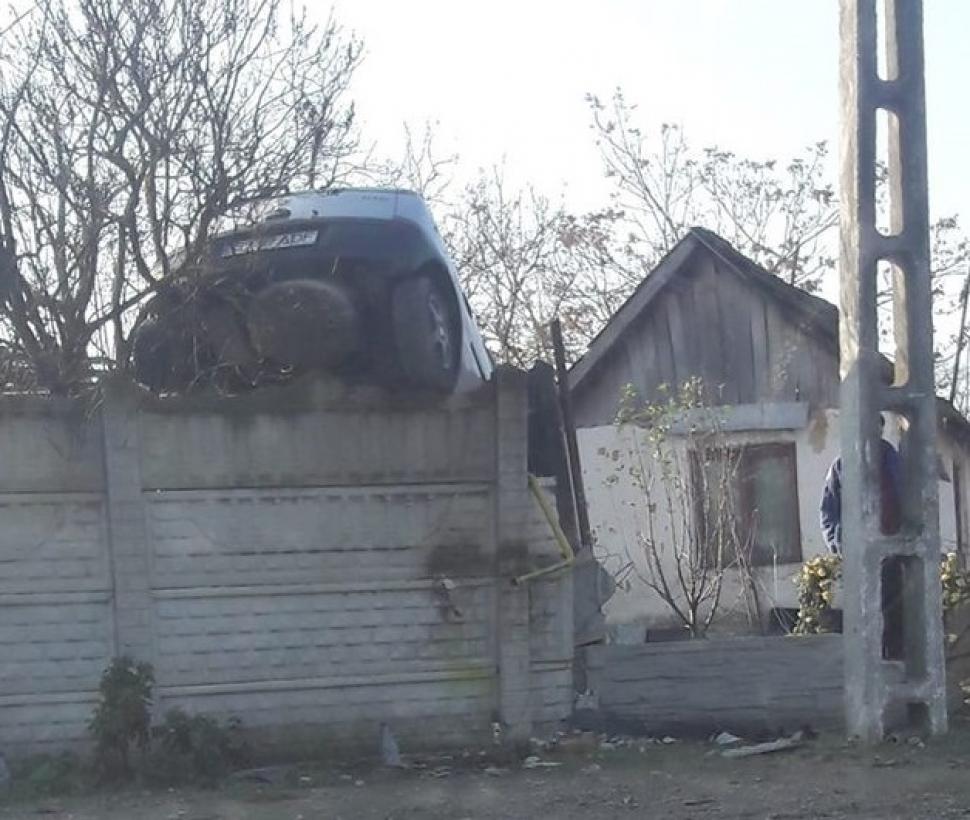 A urcat cu mașina pe gard. “Cascadorul” e din Gorj