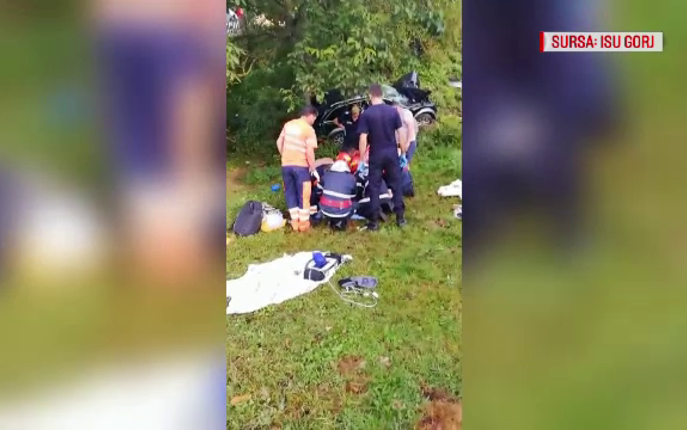 Imagini dramatice joi dimineață în județul Gorj. O mașină în care se aflau un bărbat și 3 tinere s-a răsturnat într-o râpă, în localitatea Padeș.
