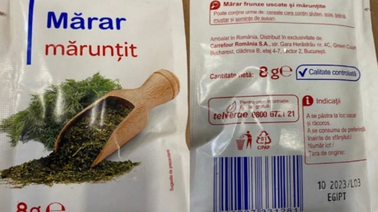 Autoritatea Națională Sanitar-Veterinară a transmis o alertă ca urmare a notificării primite din partea Carrefour cu privire la un sortiment de mărar uscat și mărunțit ce a fost retras de la vânzare. Mai exact, este vorba despre un plic de mărar, frunze uscate și mărunțite, în cazul căruia s-au depășit limitele maxime admise ale reziduurilor de pesticide: Chlorpyrifos, Carbendazim, Penconazole, Pendimethalin și Vinclozolin. Cei care au achiziţionat acest tip de mărar…