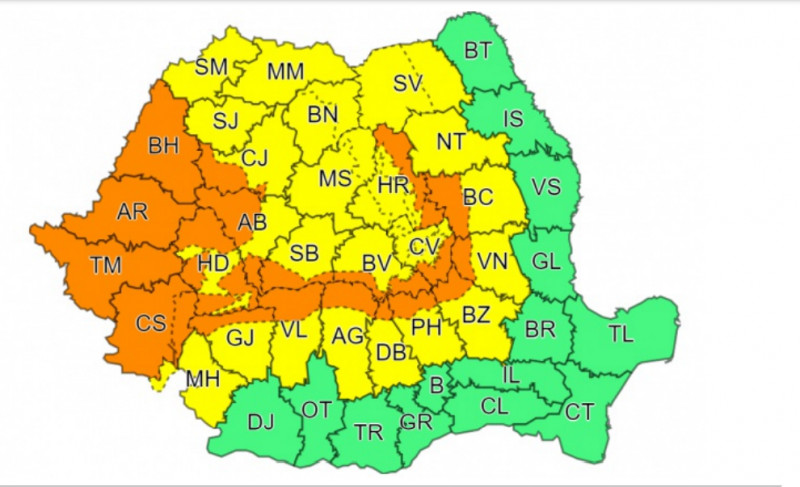 Administrația Națională de Meteorologie a emis avertizări Cod portocaliu și galben de ploi torențiale și vijelii. 19 județe vor fi sub avertizare Cod portocaliu până vineri dimineață.