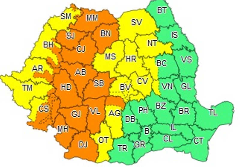 Începând de vineri, ora 14:00 până la ora 21:00, în zona montană a județelor Satu Mare, Maramureș, Sălaj, Suceava, Bistrița-Năsăud, Neamț, Harghita, Mureș, Brașov, Covasna, Prahova, Dâmbovița, Argeș, Vâlcea, Gorj, Sibiu, Alba, Cluj, Bihor, Arad, Timiș, Caraș Severin, Hunedoara, Bacău, Vrancea și Buzău…