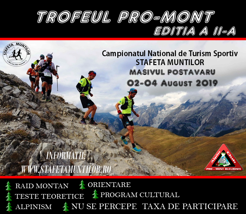 Asociația Alpin Club Pro-Mont București organizează cea de-a doua ediție a Trofeului ,,Pro-Mont”, ce reprezintă cea de-a patra etapă din cadrul Campionatului Național de Turism Sportiv ,,Ștafeta Munților” 2019, etapă organizată în perioada 2-4 august 2019 în Masivul Postăvaru, arie naturală ROSCI0207 – sit de importanță comunitară a rețelei ecologice europene Natura 2000.