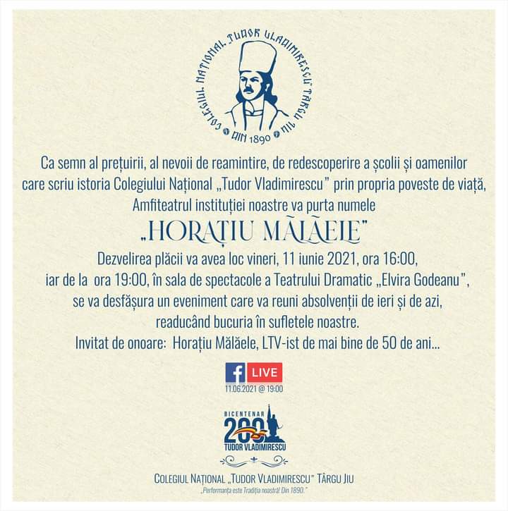 Amfiteatrul Colegiului Național “Tudor Vladimirescu” va purta numele cunoscutului actor Horațiu Mălăele. “Dezvelirea plăcii va avea loc vineri, 11 iunie, ora 16:00, iar de la ora 19:00, în sala de spectacole a Teatrului Dramatic “Elvira Godeanu”, se va desfășura un eveniment care va reuni absolvenții de ieri și de azi, readucând bucuria în sufletele noastre. Invitat de onoare: Horațiu Mălăele, LTV-ist de ani bine de 50 de ani”, au anunțat reprezentanții…