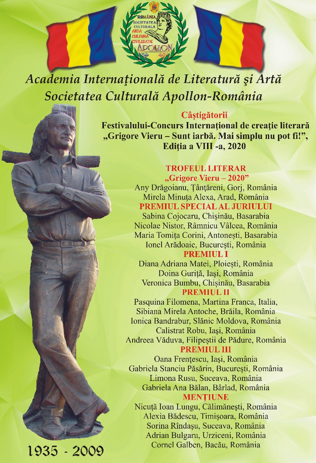 Sâmbătă, 7 martie 2020, începând cu ora 10:00, a avut loc o nouă „LECŢIE DE POEZIE”, la Artoteca Bibliotecii Metropolitane București. Regalul de poezie a început cu Gala decernării premiilor Ediției a VIII – a, a Festivalului Concurs Internațional de Creație Literară „Grigore Vieru”, secțiunea poezie, intitulat „Sunt iarbă, mai simplu nu pot fi!”. Organizatorul festivalului a fost ,,Societatea Culturală Apollon-România”, care, la începutul acestui an, a…
