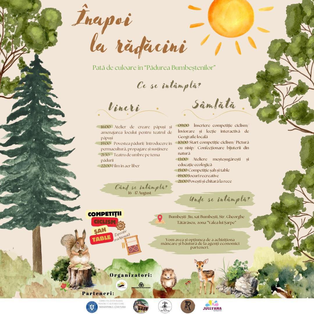 Părinții și copiii din Bumbești Jiu, județul Gorj, vor participa la jumătatea lunii august la un atelier de educație ecologică în pădurile din zona orașului. În Bumbești-Jiu există și Parcul Național „Defileul Jiului”. Evenimentul din zilele de 16 și 17 august va fi organizat de Jullyana și „Asociația mediu curat – viața sănătoasă” și este denumit „Înapoi la rădăcini”.