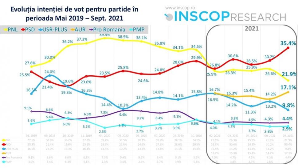 Înainte de căderea Guvernului Cîțu, PSD a ajuns la 35, 4%, PNL la 21,9%, USR a căzut la 9,8 % iar AUR urcă la 17,1% și își dublează scorul electoral,se arată într-un sondaj Inscop realizat în perioada 15 – 27 septembrie 2021.