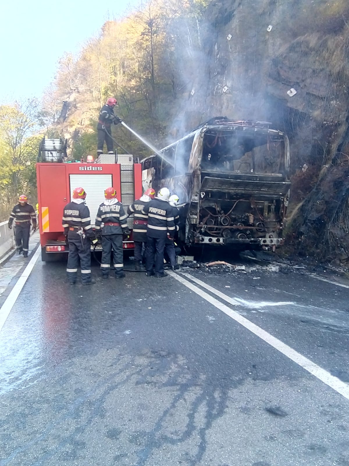 Un autocar a fpst curpins de flări, astăzi la prânz, pe Defileul Jiului. Circulaţia rutieră a fost întreruptă pe DN 66 Petroşani – Târgu Jiu (Defileul Jiului), la kilometrul 120+400 metri, la limita dintre judeţele Gorj şi Hunedoara.