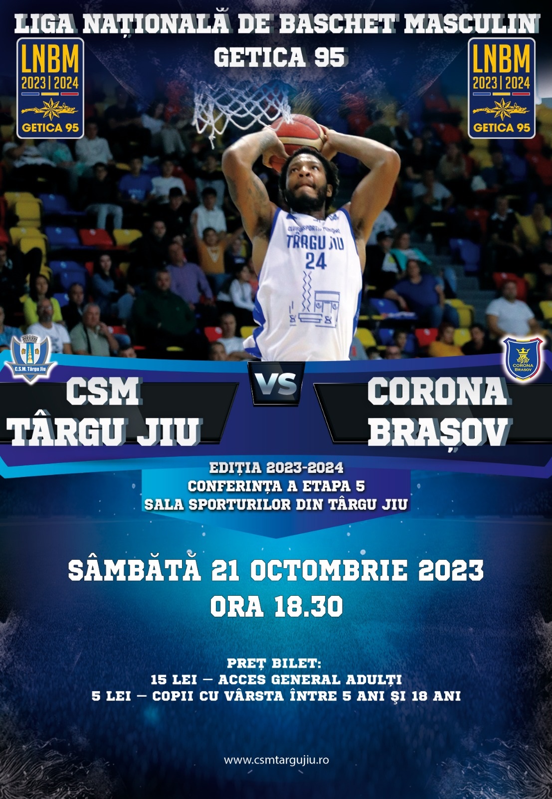 Baschetbaliștii CSM Târgu Jiu joacă, sâmbătă, cu gândul la cea de-a treia victorie din actuala stagiune a Ligii Naționale de Baschet Masculin Getica 95. La Târgu Jiu ajunge nou-promovata Corona Brașov. Meciul va începe la ora 18.30.