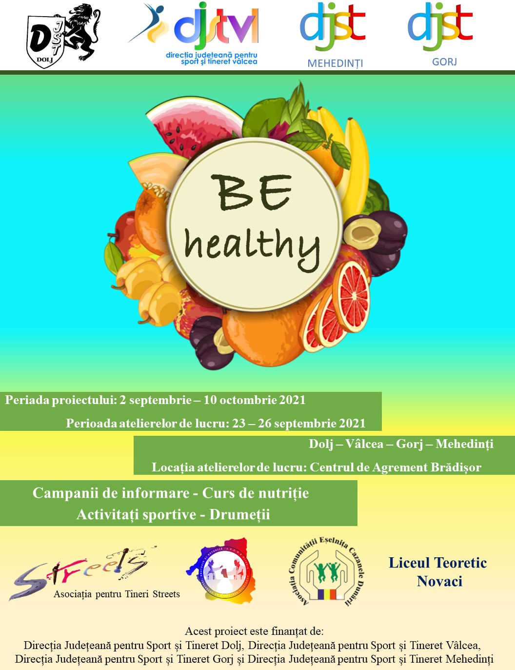 Tineri din Dolj și alte trei județe vor fi informați despre importanța activităților fizice și ale alimentației sănătoase în perioada 2 septembrie – 10 octombrie 2021, în cadrul proiectului Be healthy! Scopul proiectului este susținerea sănătății și calității vieții tinerilor.