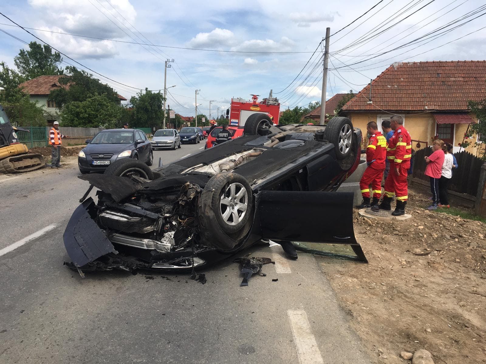 Mașina s-a răsturnat pe partea carosabilă, iar traficul a fost blocat. Tânărul