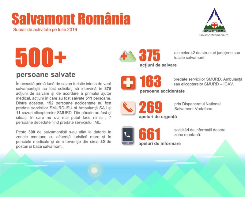 Luna iulie, chiar dacă este o lună de debut a sezonului de vară, este caracterizată ca o perioadă cu activitate turistică intensă, cu un număr foarte de turiști pe munte, fapt ce a impus asigurarea asistența de salvare montană la un nivel ridicat, zilnic, un număr de 250 – 300 de salvamontiști aflându-se la datorie în zonele montane cu afluență turistică mare, în zonele de practicare intensivă a sporturilor montane, în punctele medicale și de intervenție din cca 90 de posturi și baze salvamont.În această perioadă salvamontiștii au fost solicitați să intervină în 373 de acțiuni de salvare și de acordare a primului ajutor medical, acțiuni în care au fost salvate 511 persoane. Dintre acestea, 152 de persoane accidentate au fost predate serviciilor SMURD sau de Ambulanță, iar 11 persoane, elicopterelor de salvare SMURD-IGAV. Din păcate, 7 persoane au decedat pe munte, sarcina salvamontiștilor reducându-se la recuperarea acestora și transportul pentru predarea la serviciile IML.Prin Dispeceratul Național Salvamont-Vodafone au fost primite, direct, 279 de apeluri prin care anunțau accidente montane, restul apelurilor de urgență fiind primite și preluate direct de către salvamontiști prin Serviciul Unic de Urgență 112 sau prin dispeceratele locale ale echipelor salvamont. De asemenea, în cursul lunii iulie s-au primit 1.043 apeluri prin solicitau informații despre zona montană, dintre acestea, 661 apeluri au fost înregistrate la Dispeceratul National Salvamont-Vodafone, restul de 382 apeluri fiind făcute direct structurilor salvamont locale sau județene.În cadrul celor 42 de structuri Salvamont din România, singurele structuri abilitate oficial si care dețin personal pregătit profesional si atestat pentru a interveni pentru salvarea persoanelor accidentate în zona montană, activează un număr de circa 800 de salvatori montani atestați, dintre care peste 300 sunt salvatori montani angajați.Cunoscând specificul și numărul mare de intervenții din sezonul de vară, în toate zonele din țară în care se practică intensiv sporturile de vară, pe traseele turistice, în bazele, posturile și refugiile salvamont, serviciile salvamont vor continua să asigure efective maxime de salvatori montani, astfel încât să se reușească intervenția cu operativitate în situația producerii de accidente.Numărul mare de accidente cu care a debutat acest sezon de vară a determinat Salvamont România să tragă un semnal de alarmă și să lanseze în rândul iubitorilor de munte campania ,,Vara 2019- vara responsabilității pe munte” prin care se dorește reducerea numărului de accidente montane. Echipele Salvamont, singurele structuri care dețin competența legală, personal pregătit profesional și atestat pentru a interveni în soluționarea accidentelor montane în care sunt implicate persoane cu afecțiuni medicale pot fi alertate prin sistemul unic de urgență 112 și prin intermediul Dispeceratului Național Salvamont (0372126668 sau 0SALVAMONT) sau de pe aplicația Salvamont-Vodafone pentru telefoanele mobile.