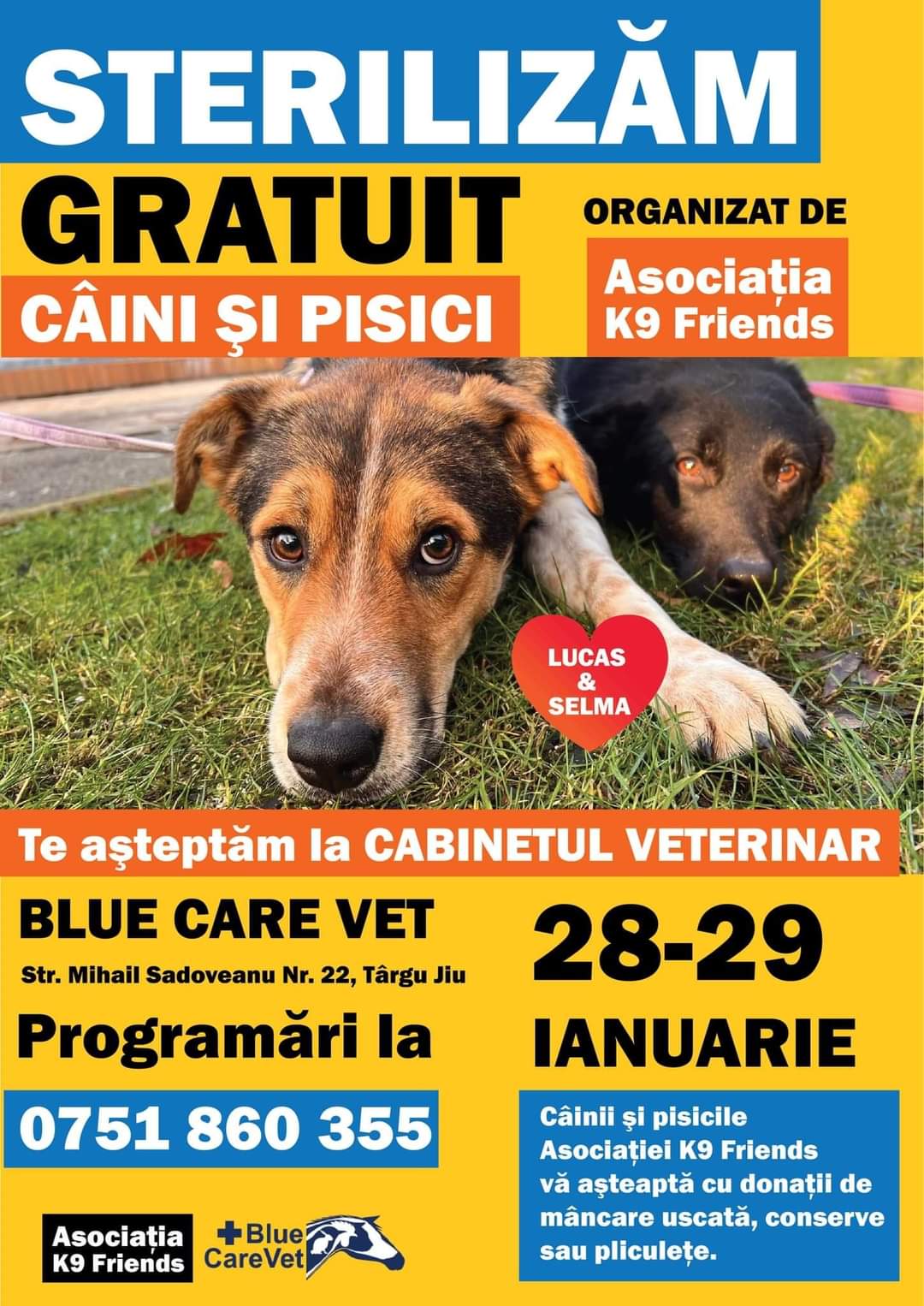 Asociația K 9 Friends alături de Blue Care Vet organizeză pe 28 și 29 ianuarie, la Târgu Jiu, o campanie de sterilizări gratuite a câinilor și pisicilor.