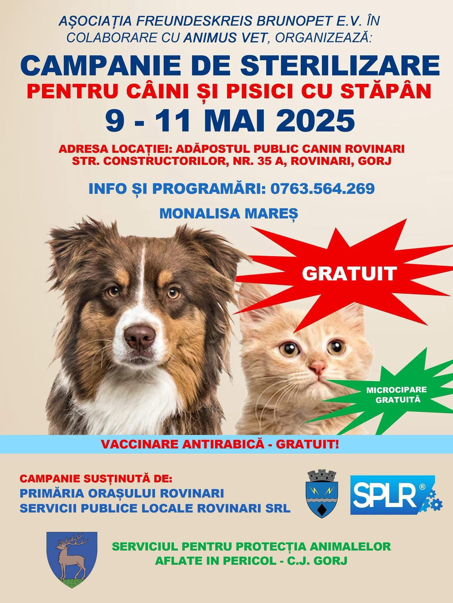 Asociația Freundeskreis Brunopet e.V., în colaborare cu Animus Vet, organizează în perioada 9 – 11 mai 2025 o amplă campanie de sterilizare gratuită pentru câini și pisici cu stăpân, în municipiul Rovinari.