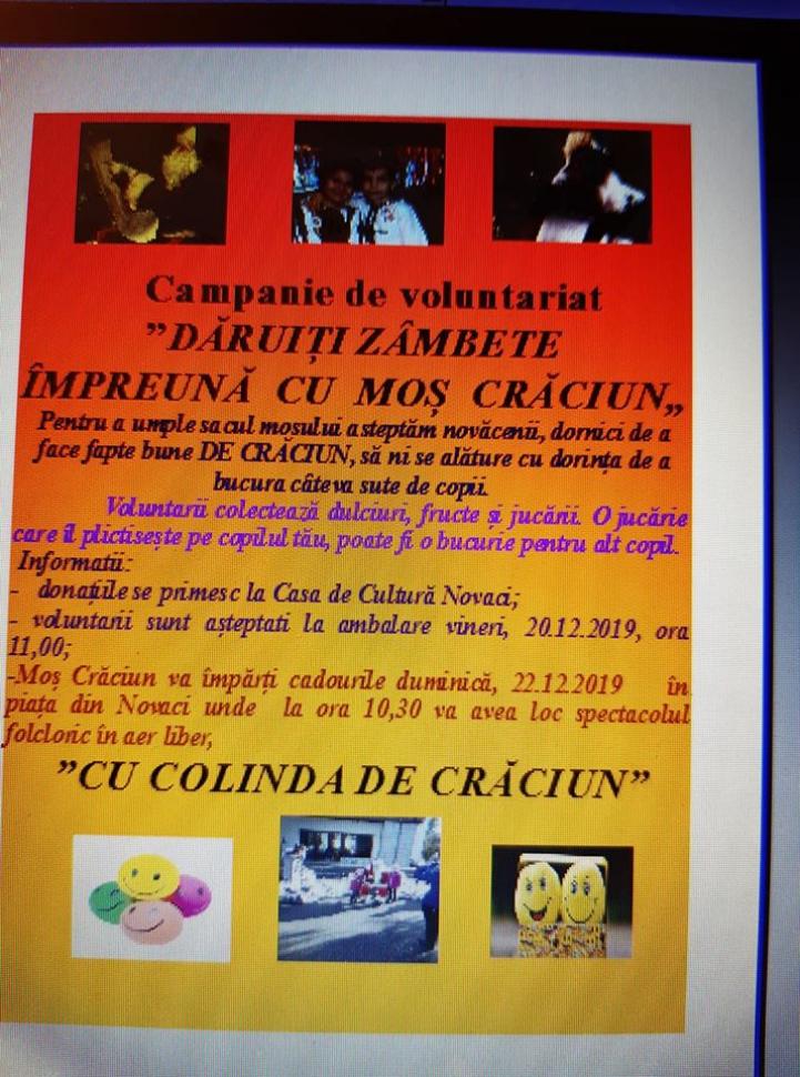 Campanie pentru sute de copii care nu sunt pe lista lui Moș Crăciun. Novăcenii sunt chemați să aducă un zâmbet pe chipul copiilor mai puțin norocoși. Campania „Dăruiți zâmbete împreună cu Moș Crăciun” a fost inițiată de reprezentanții Casei de Cultură din Novaci. Voluntarii vor strânge fructe, dulciuri, haine și jucării pe care le vor oferi micuților înainte de Crăciun.