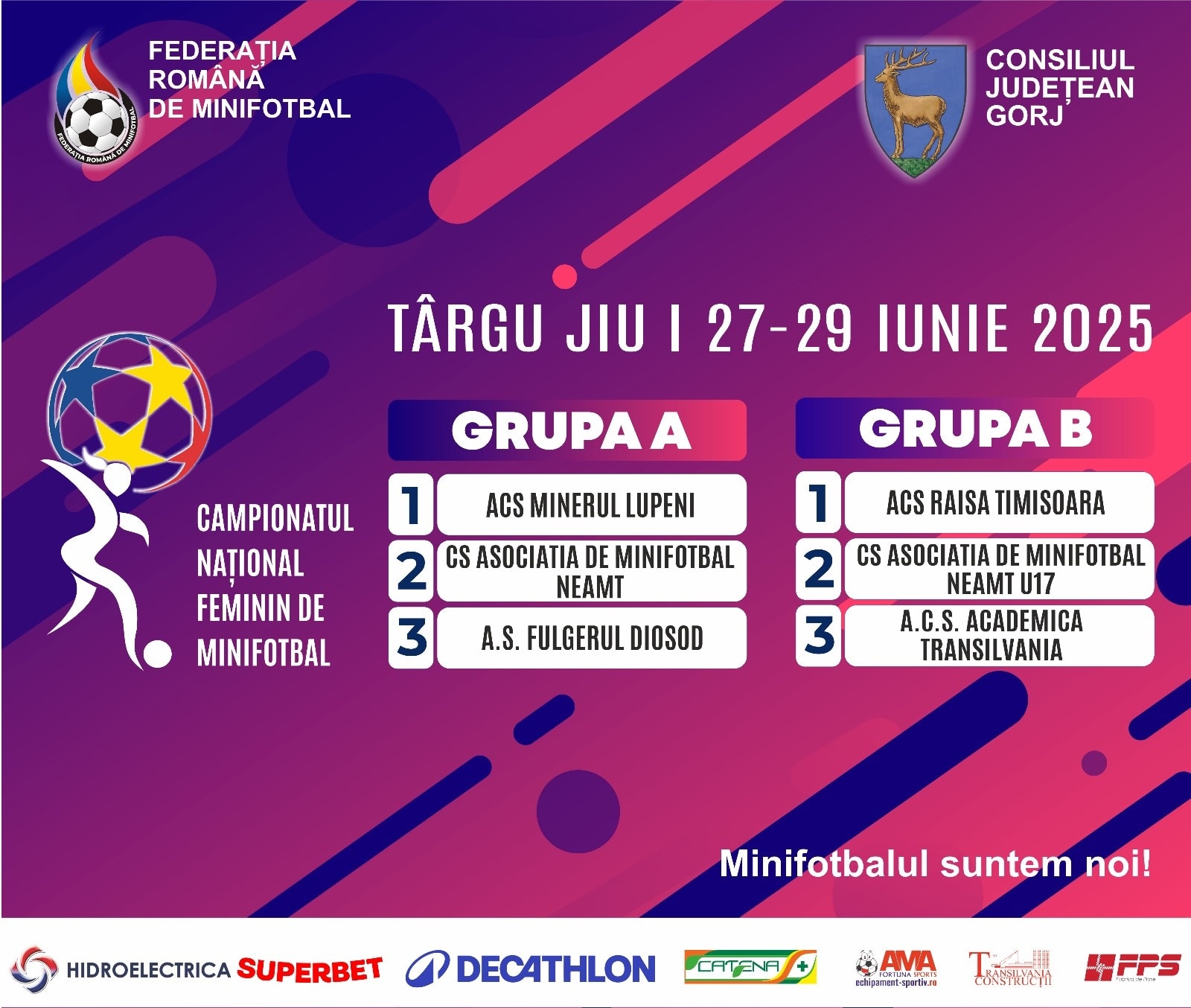 Campionatul Național Feminin de Minifotbal se va disputa, în perioada 27-29 iunie, în premieră la Târgu-Jiu. Tot în această perioadă în municipiu va avea loc și Campionatul Național de Old Boys.