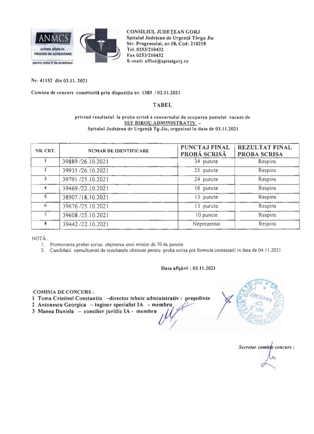 Candidații care și-au anonimizat numele pentru concursul de șef birou administrativ au picat toți proba scrisă. Toți au depus cereri de anonimizare a numelui și au primit numere. Astfel, în toate comunicările legate de organizarea examenului nu apare niciunul dintre numele participanților la concurs.