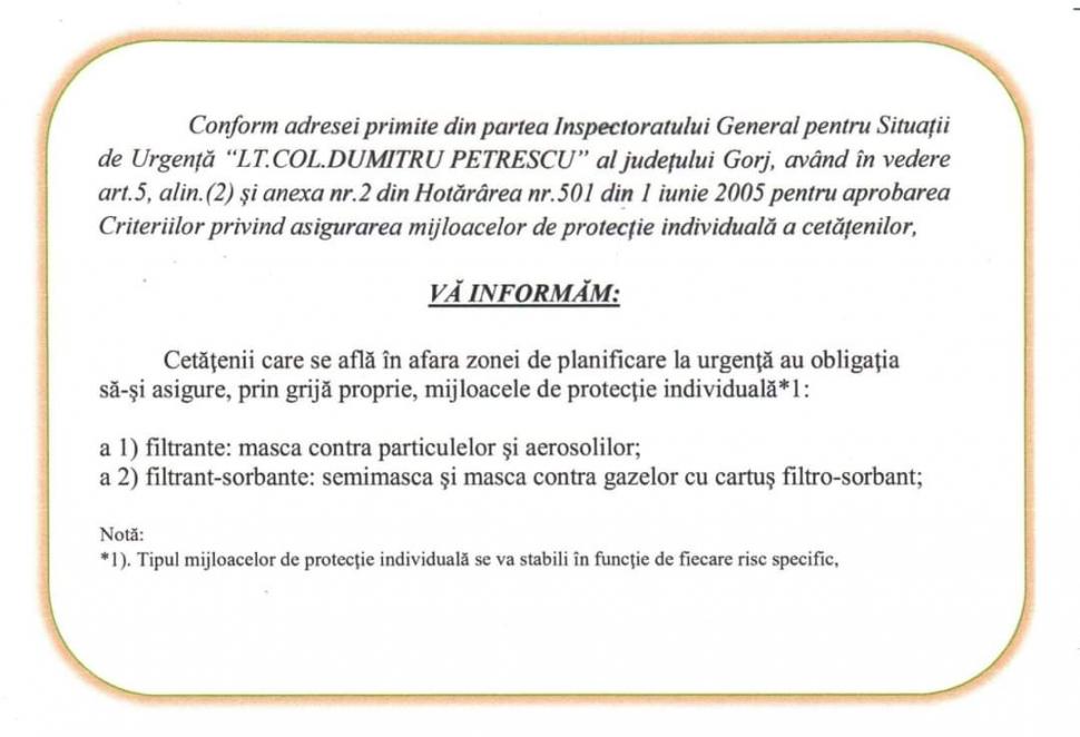 Primarii din județul Gorj au primit o înștiințare din partea Inspectoratului pentru Situații de Urgență, cu privire la o eventuală poluare a aerului. Astfel, primarul din Scoarța, Ion Stamatoiu, a postat pe pagina sa de socializare mesajul ISU prin care se face referire la instruirea tuturor cetățenilor cu privirea la un eventual risc.