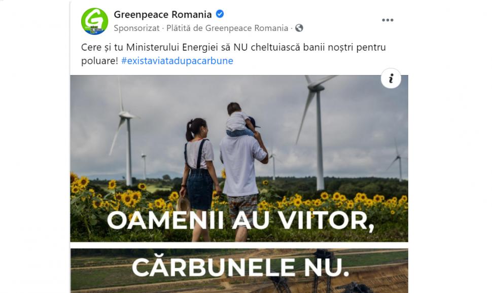Ecologiștii de la Greenpeace au sponsorizat pe facebook o postare prin care îndeamnă românii să trimită Ministerului Energiei o petiție împotriva cărbunelui. Deja 4.300 de români au semnat petiția. Iată care este textul petiției: