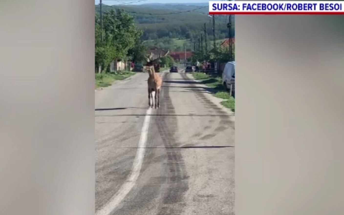 Priveliște cât se poate de rară într-o localitate din Gorj! O minunăție de cerb lopătar a fost filmat la plimbare, pe strada principală.