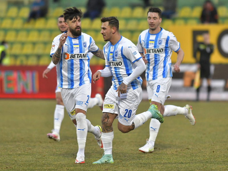 Universitatea Craiova a bifat a cincea victorie consecutivă în Liga 1. Alb-albaştrii s-au impus cu 3-0 pe un teren greu, la CS Mioveni. Jovan Markovic (‘26, ‘34) a reuşit o dublă de efect, iar Ştefan Baiaram (‘78) a securizat punctele pentru juveţi după o pasă foarte bună a lui Cîmpanu. Oaspeţii au evoluat în această deplasare cu un echipament special. Oltenii și-au trecut pe spatele tricourilor numele celor mai importante orașe din Ucraina, un gest de solidaritate…