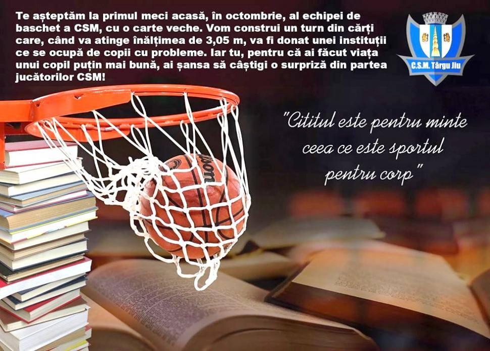 3 05 m de carti au fost strânși de către CSM Târgu Jiu în campania “Cititul deschide lumi noi”. Întreaga colecție fost donată unui centru social din oraș, beneficiarii fiind încântați de gestul sportivilor gorjeni.