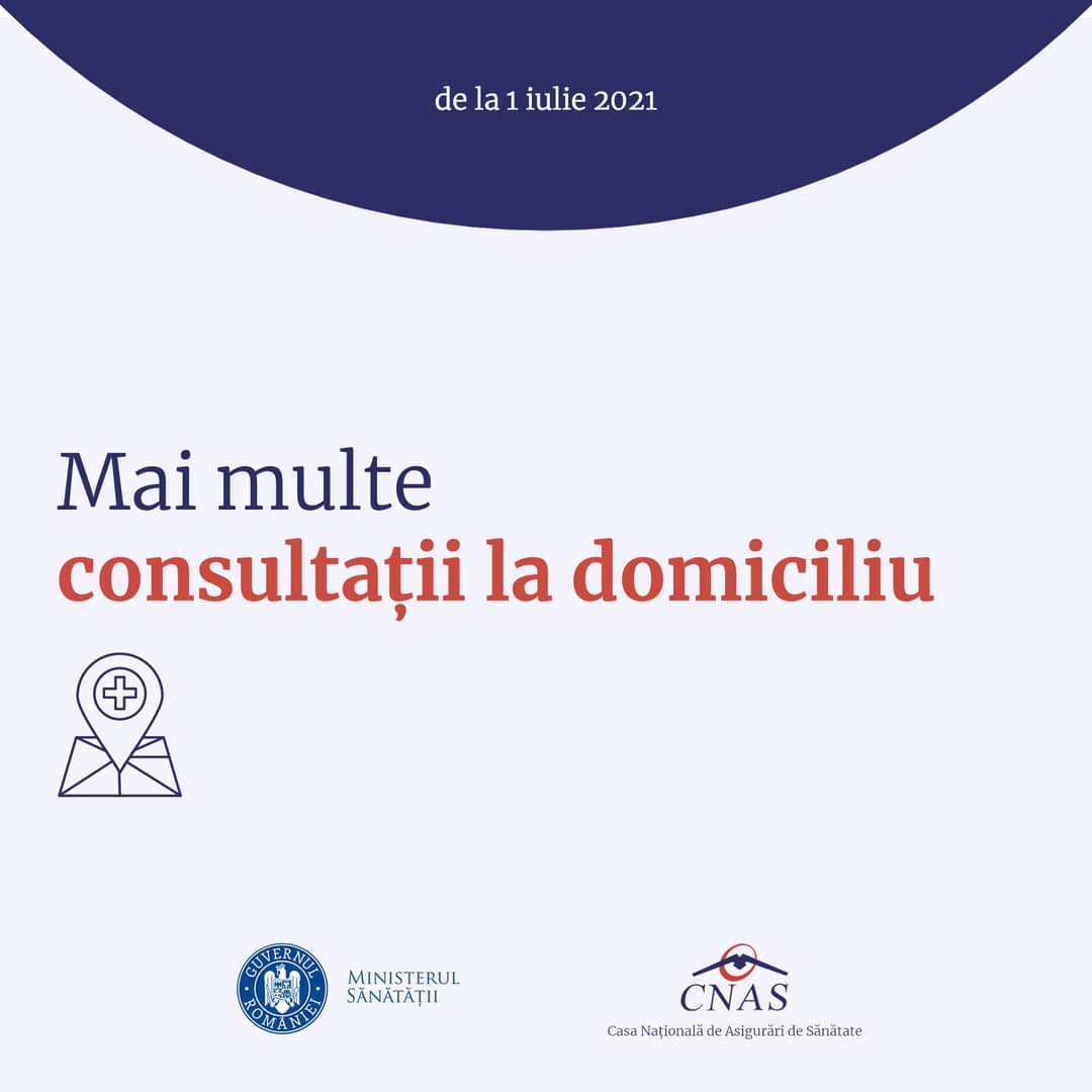 “Începând cu data de 1 iulie 2021, pacienții cu boli cronice, care nu se pot deplasa la cabinetul medicului de familie, pot beneficia de o consultație la domiciliu pe lună. Până la această dată, medicul de familie putea să acorde maximum 4 consultații la domiciliu pe an. Lăuzele, indiferent dacă sunt asigurate sau neasigurate, pe lângă consultația la domiciliu acordată de medicul de familie la externarea din maternitate, vor beneficia de încă o consultație la domiciliu,…