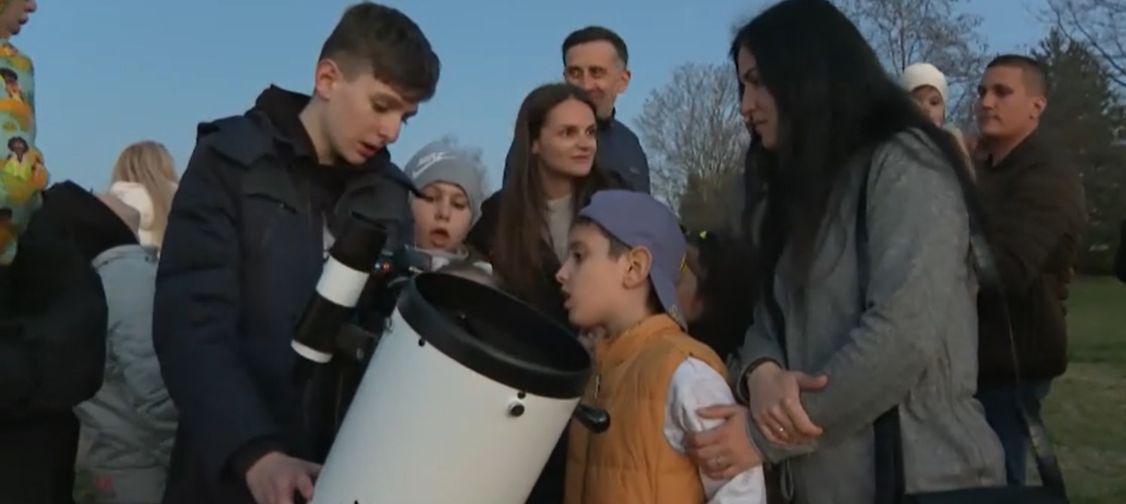 Zeci de copii și adulți au venit, duminică seara, în parcul Coloanei Infinitului, din Târgu-Jiu, pentru a privi stelele cu ajutorul unui telescop.