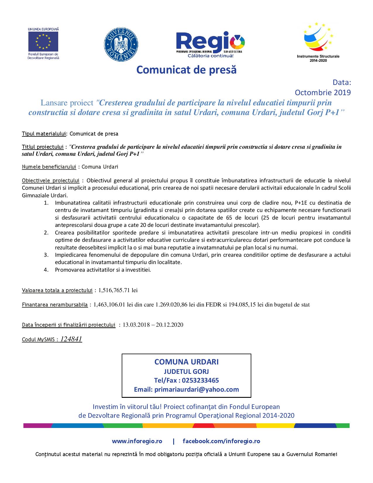 Articolul Comunicat de presă lansare proiect apare prima dată în Impact In Gorj.